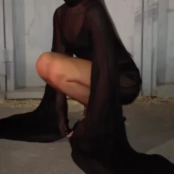 Women Cover-up Dress, Flare Sleeve Turtleneck See-through Solid Summer Mini Dress for Beach Party