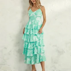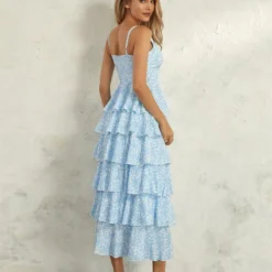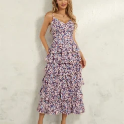 Women Floral Print Long Dress V-Neck Tiered Ruffles Sleeveless Cami Dress Summer Casual Beach Party Dress