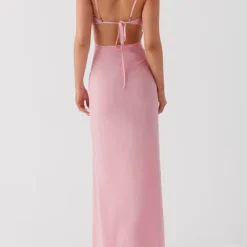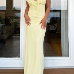 Women Ruffle Trim Cami Dress Slim Solid Color Deep V Neck Open Back Tie Long Evening Dress for Party Club