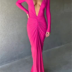 Women Long Bodycon Dress Solid Color Deep V-Neck Ruched Long Sleeve Dress Spring Fall Evening Party Dress
