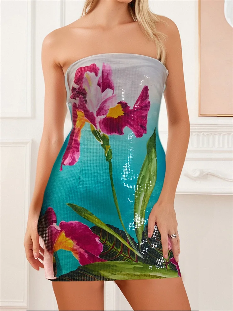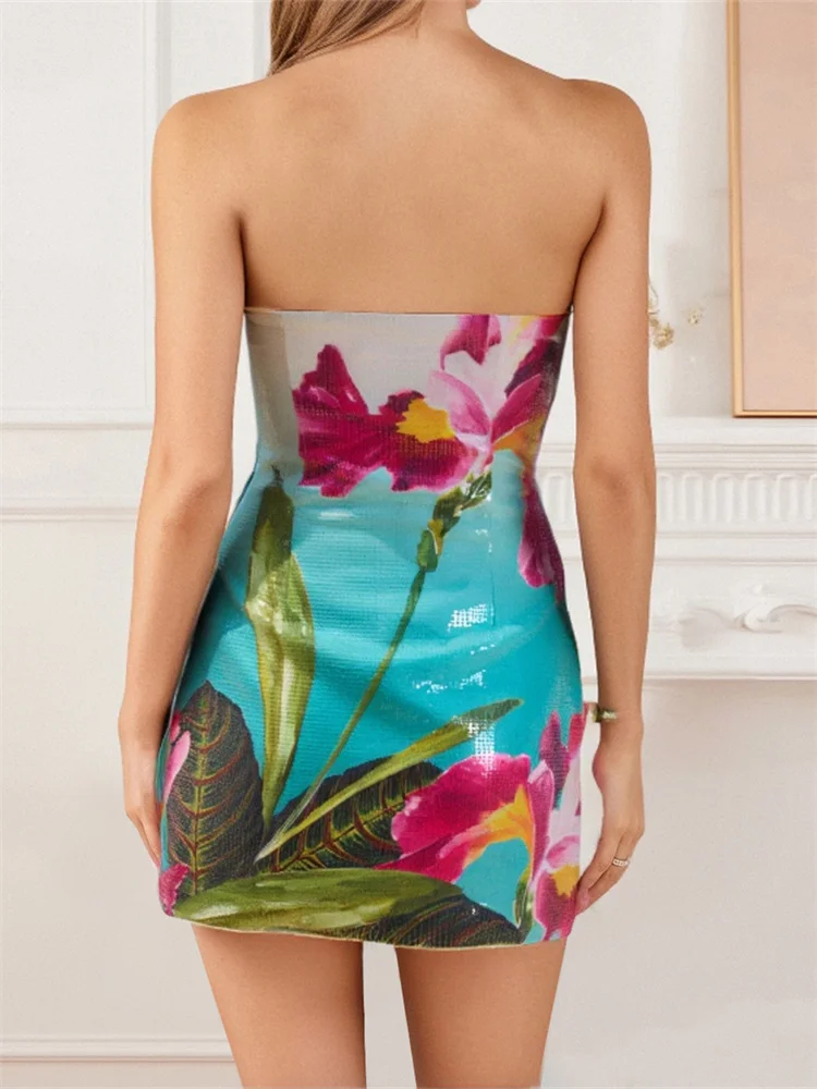 Women Summer Mini Dress Flower Printed Strapless