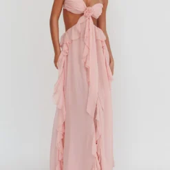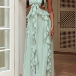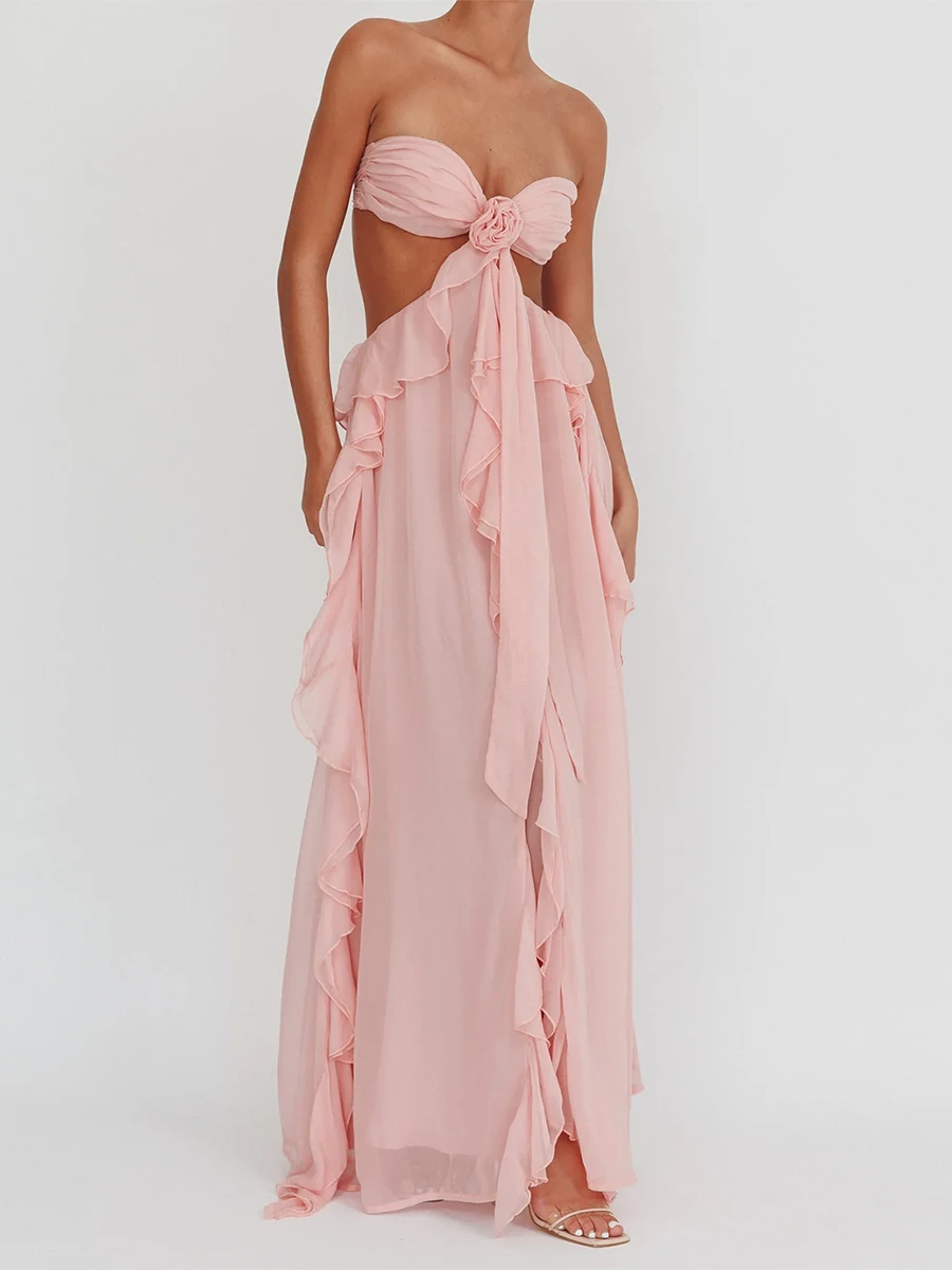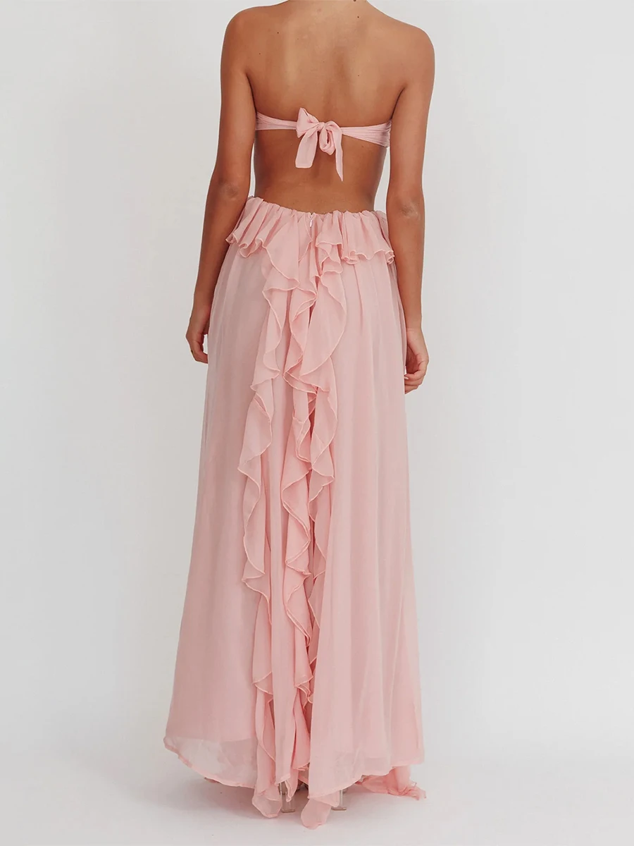 Women's Cutout Ball Gown Sleeveless Tie Back Solid Color Ruffle Long Dress Summer Party Dress