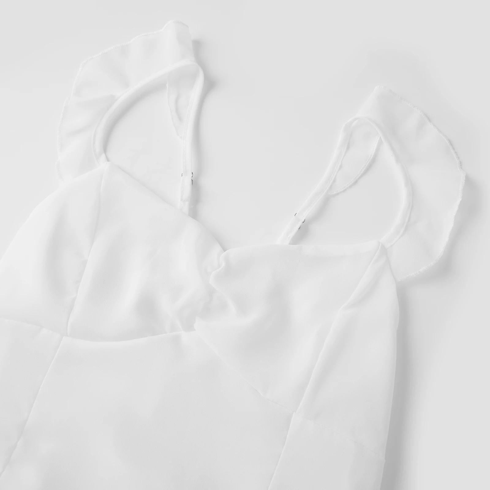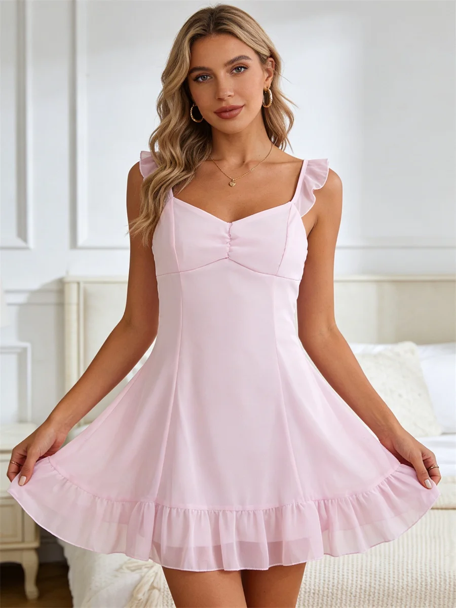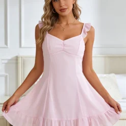 Women’s Summer Mini Dress Stylish Solid Color Ruffled Trim V Neck Sleeveless A Line Dress