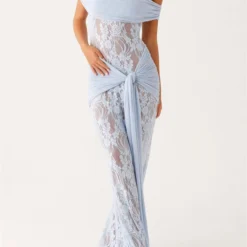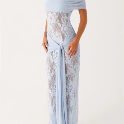 Women's Long Evening Dress Off Shoulder Knotted Slim Lace Dress