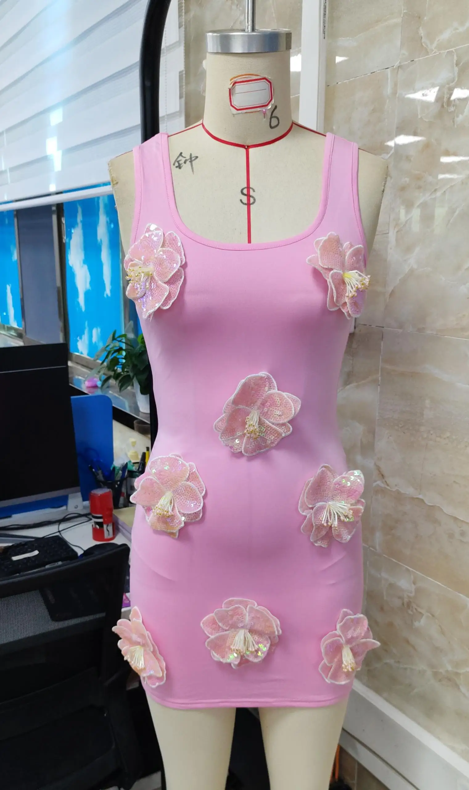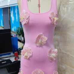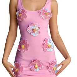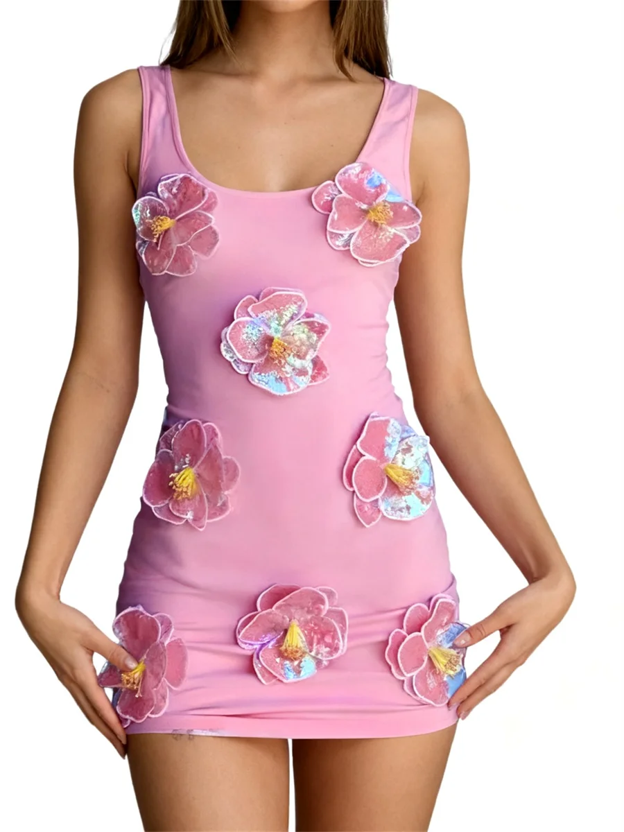 Women's Summer Tank Dress Sleeveless U Neck 3D Sequins Flower Decor Slim Dress